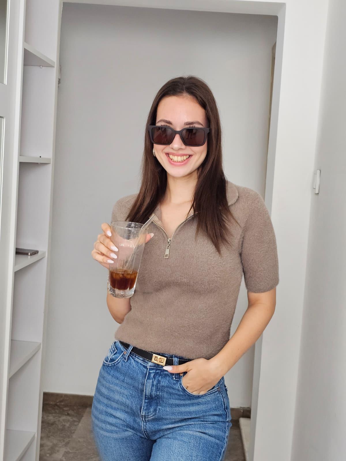 FELİX13159 Polo Yaka Fermuarlı Kısa Kol Vizon Triko Kazak