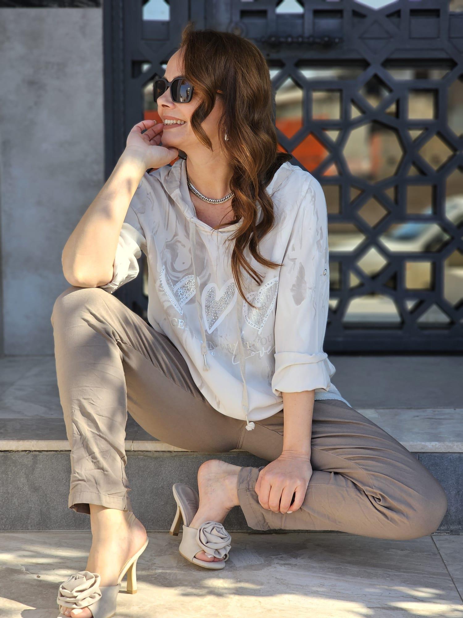 FELİX13365 Kapüşonlu Kalp Taş Baskılı İthal Saten Taş Rengi Bluz