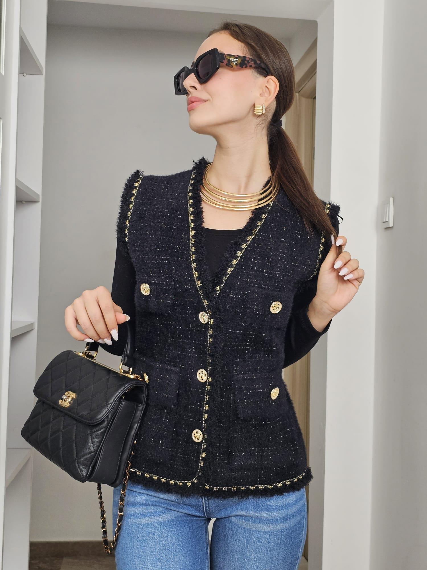 FELİX14061 Sim Püskül Detaylı Siyah Angora Yelek