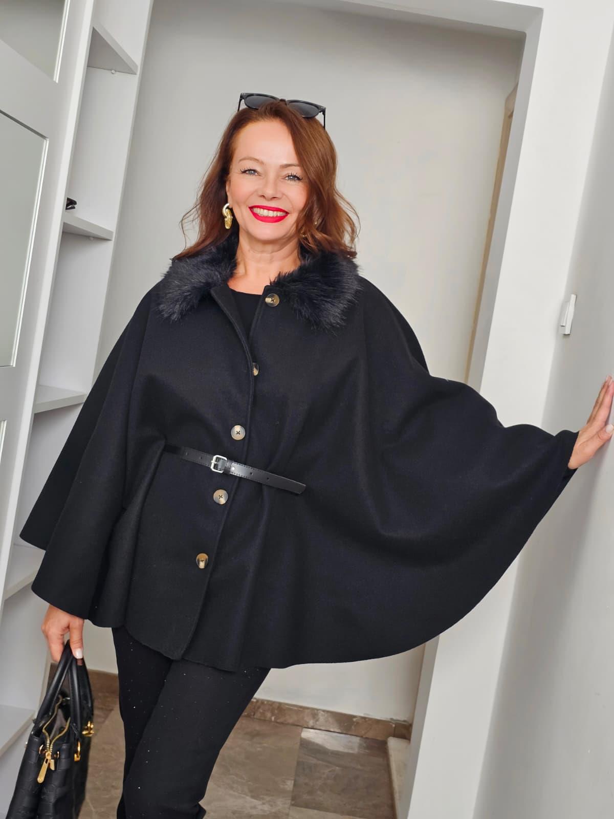 FELİX14137 Yakası Kürklü Kemerli Siyah Panço Ceket