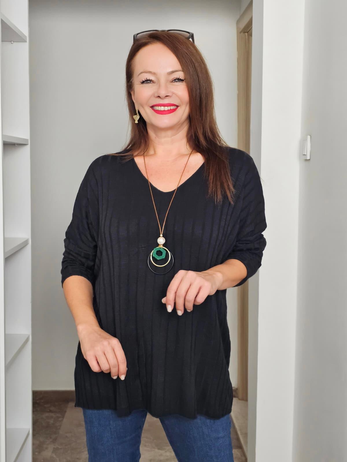 FELİX14160 V Yaka Kendinden Çizgili Rahat Kalıp Kolyeli İthal Siyah Triko