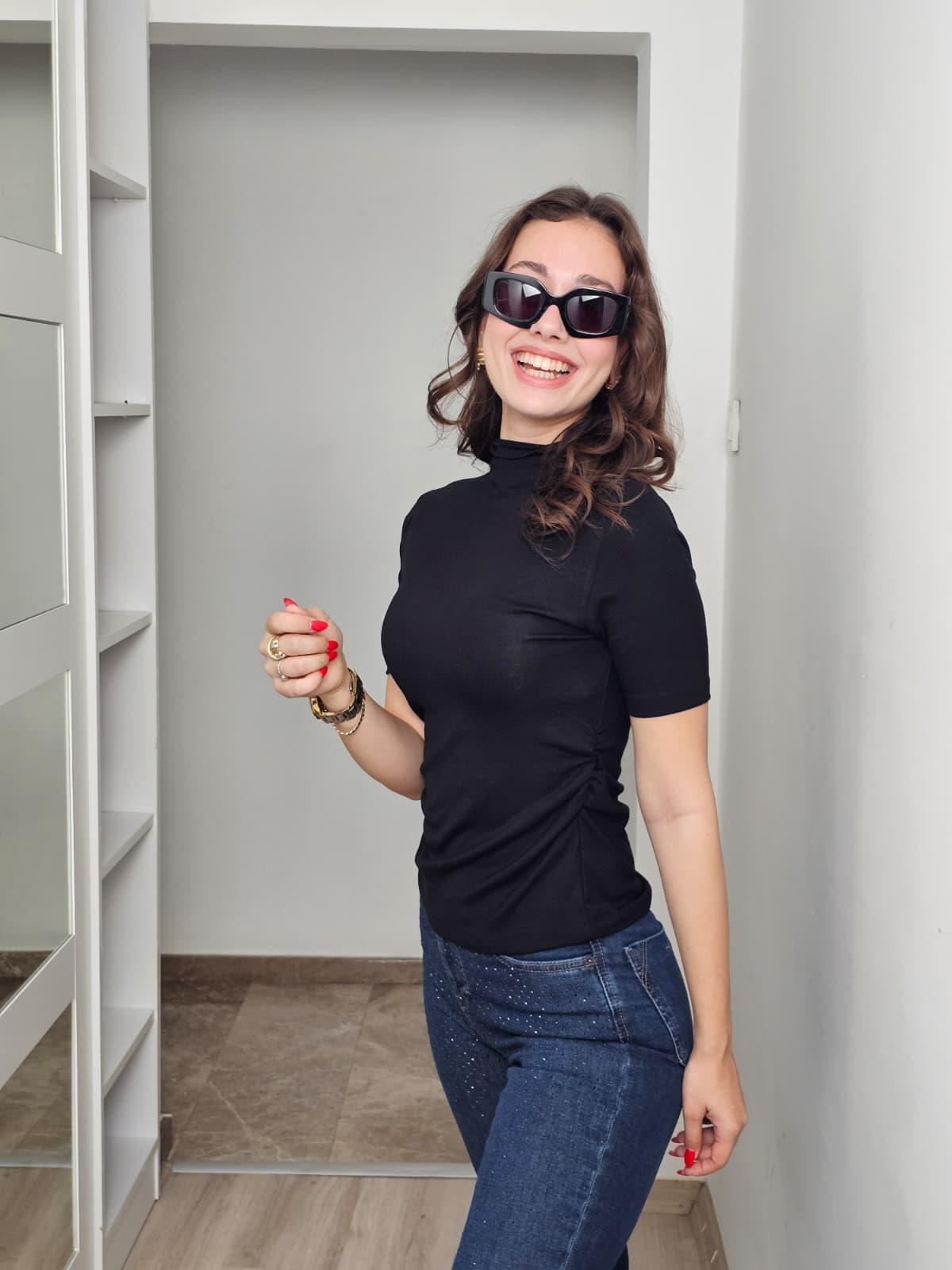FELİX14174 Dik Yaka Kısa Kol Belden Büzgülü Siyah Bluz