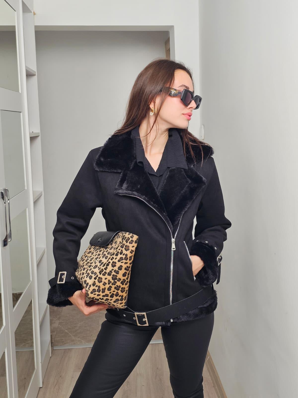 FELİX14221 İçi Kürklü Kol Ve Etek Ucu Kemer Detaylı Siyah Mont