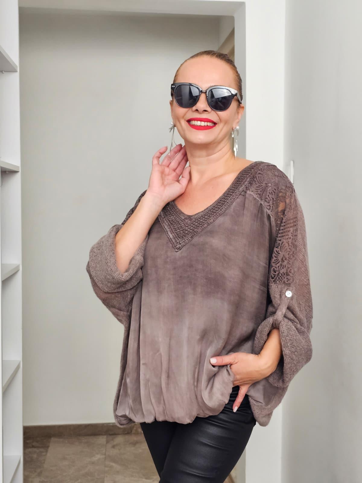 FELİX14250 V Yaka Önü İpekli Pul Danteli Etek Ucu Lastikli İthal Kahverengi Triko Bluz